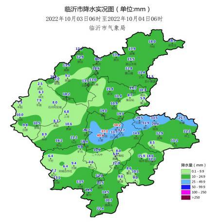 10月03日06時至10月04日06時全市平均降水量13.7,折合水量約2.36億方,其中莒南21.4市區(qū)18.8郯城15.1沂水14.6蒙陰12.3臨沭12.1費縣12沂南11.5蘭陵10.2平邑7.8。25~50的有13個站,10~25的99個,排在前3位的是蘭山義堂40.4蘭山棗園37.1蘭山臨沂本站34.2。